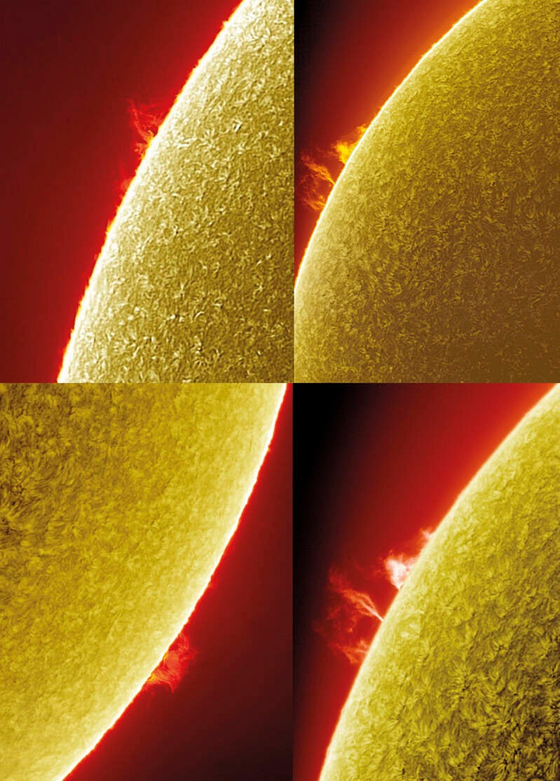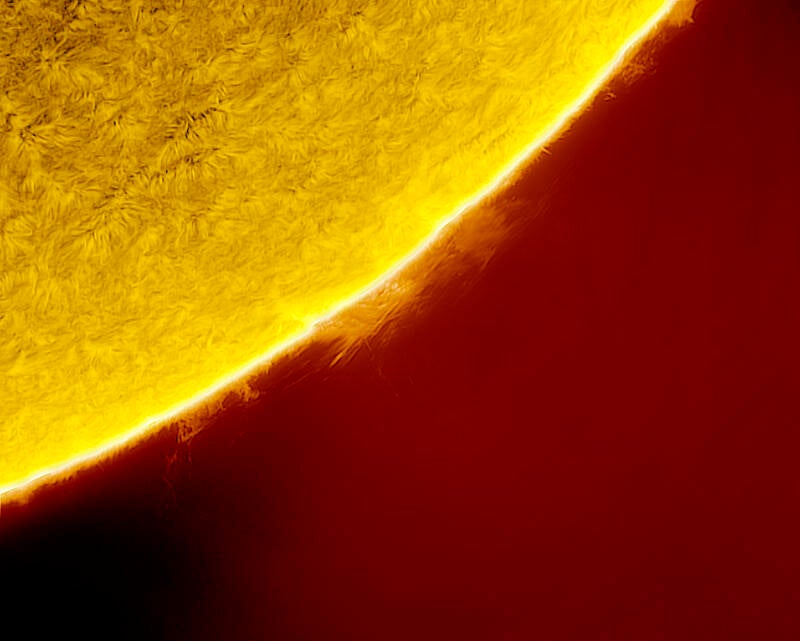 Le protuberanze solari sono grandi strutture di gas incandescente che si ergono dalla superficie del Sole, formando un'imponente e spettacolare manifestazione dell'attività solare. Sono costituite principalmente da idrogeno ionizzato e sono visibili come formazioni ad arco che si estendono dalla fotosfera solare verso l'esterno.